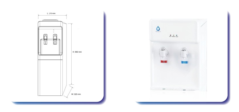 - Versión de agua Fría y Caliente, capacidad dimensional del tanque 1.5 L a 90°C/h y 2.5L a 10°C/h.